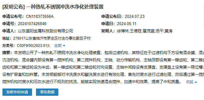 2024年7月23日,山東盛陽金屬科技股份有限公司成功申請一項名為“一種熱軋不銹鋼沖洗水凈化處理裝置”專利,申請公布號為CN118373556A,申請日期為2024年6月11日。