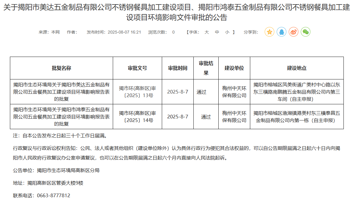 2025年8月7日,揭陽市生態(tài)環(huán)境局高新區(qū)分局就2個(gè)不銹鋼餐具加工建設(shè)項(xiàng)目環(huán)境影響報(bào)告表作出審批通過并對外進(jìn)行公告,公告期:自本公告發(fā)布之日起三十個(gè)工作日屆滿。