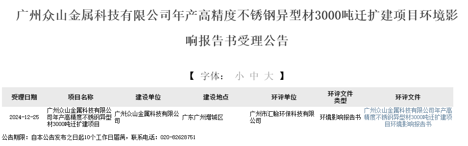 2024年12月25日,廣州市生態(tài)環(huán)境局受理廣州眾山金屬科技有限公司年產(chǎn)高精度不銹鋼異型材3000噸遷擴(kuò)建項(xiàng)目環(huán)境影響報(bào)告書并對外進(jìn)行公告,公告期:10個(gè)工作日。